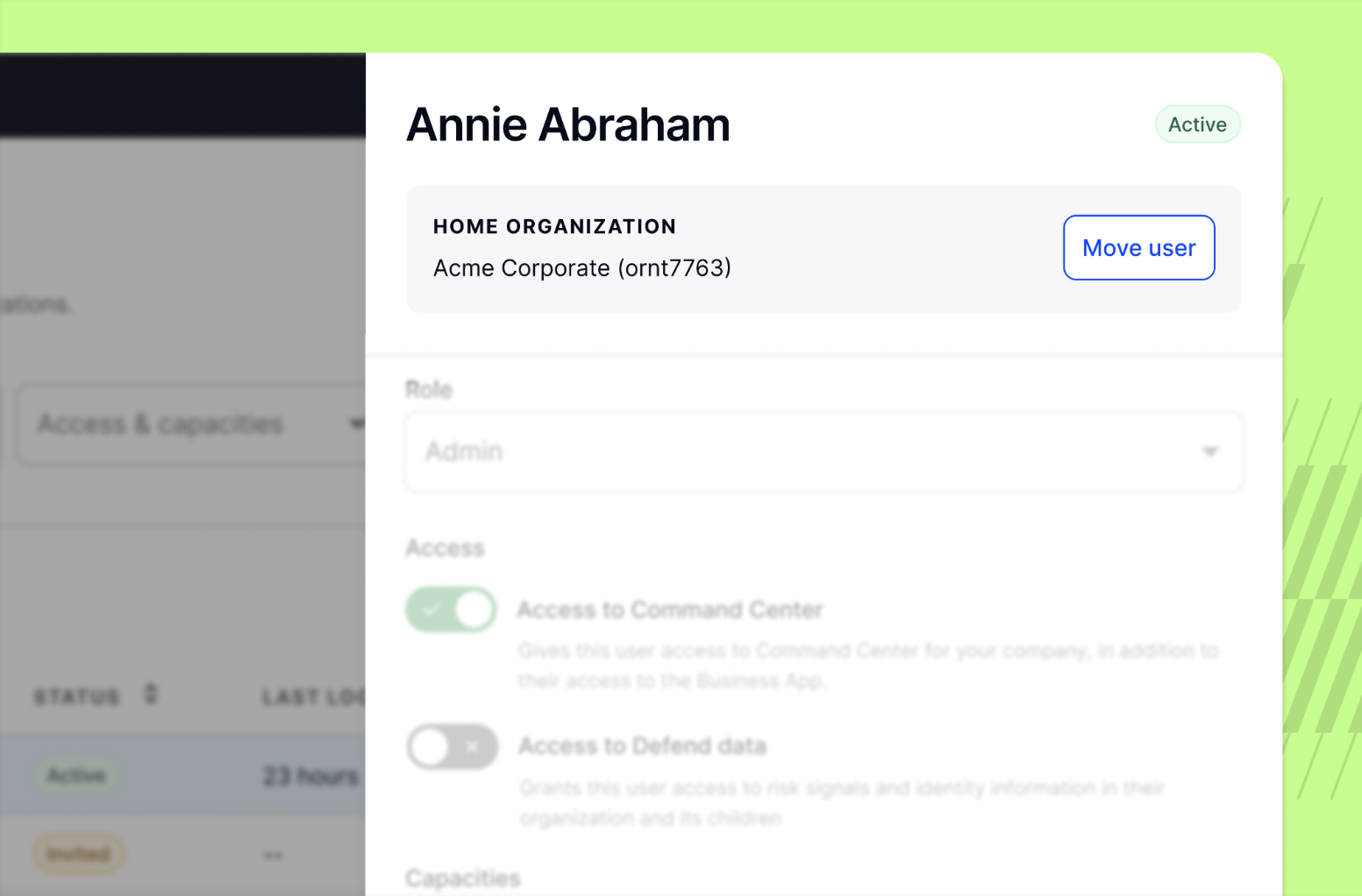 When moving a user, any existing transactions will remain with the original organization, while the user’s role and permissions will transfer to the new organization. The platform automatically identifies any edge cases that require attention or approval before finalizing the move.