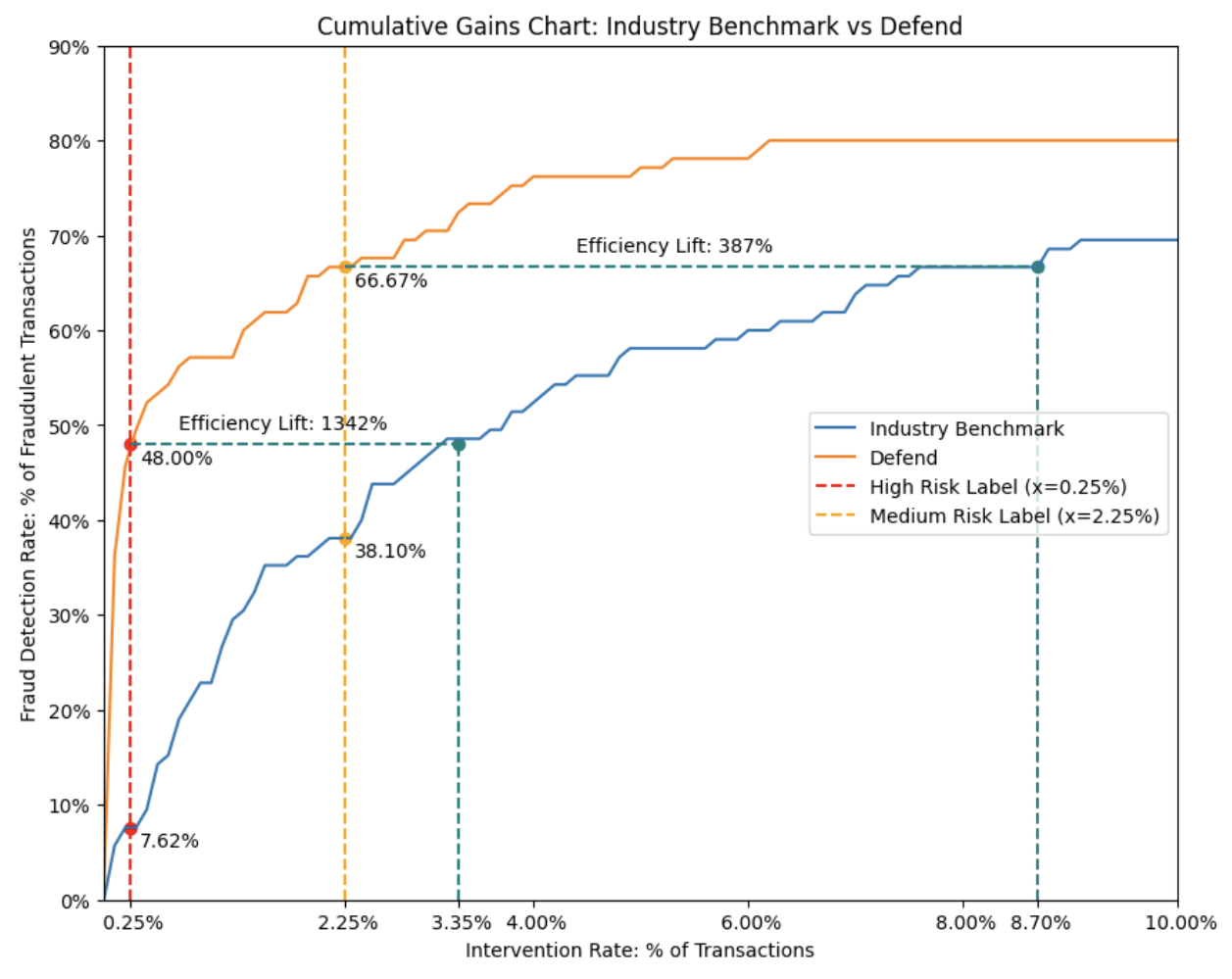 Similarly, to achieve the Defend Risk Engine’s detection rate of 67% of known fraudulent transactions at a 2.25% intervention rate (“High” plus “Medium” risk labels), the industry benchmark model would have required an intervention rate of 8.7%. This translates to nearly a 4 times improvement in efficiency delivered by the Defend Risk Engine.