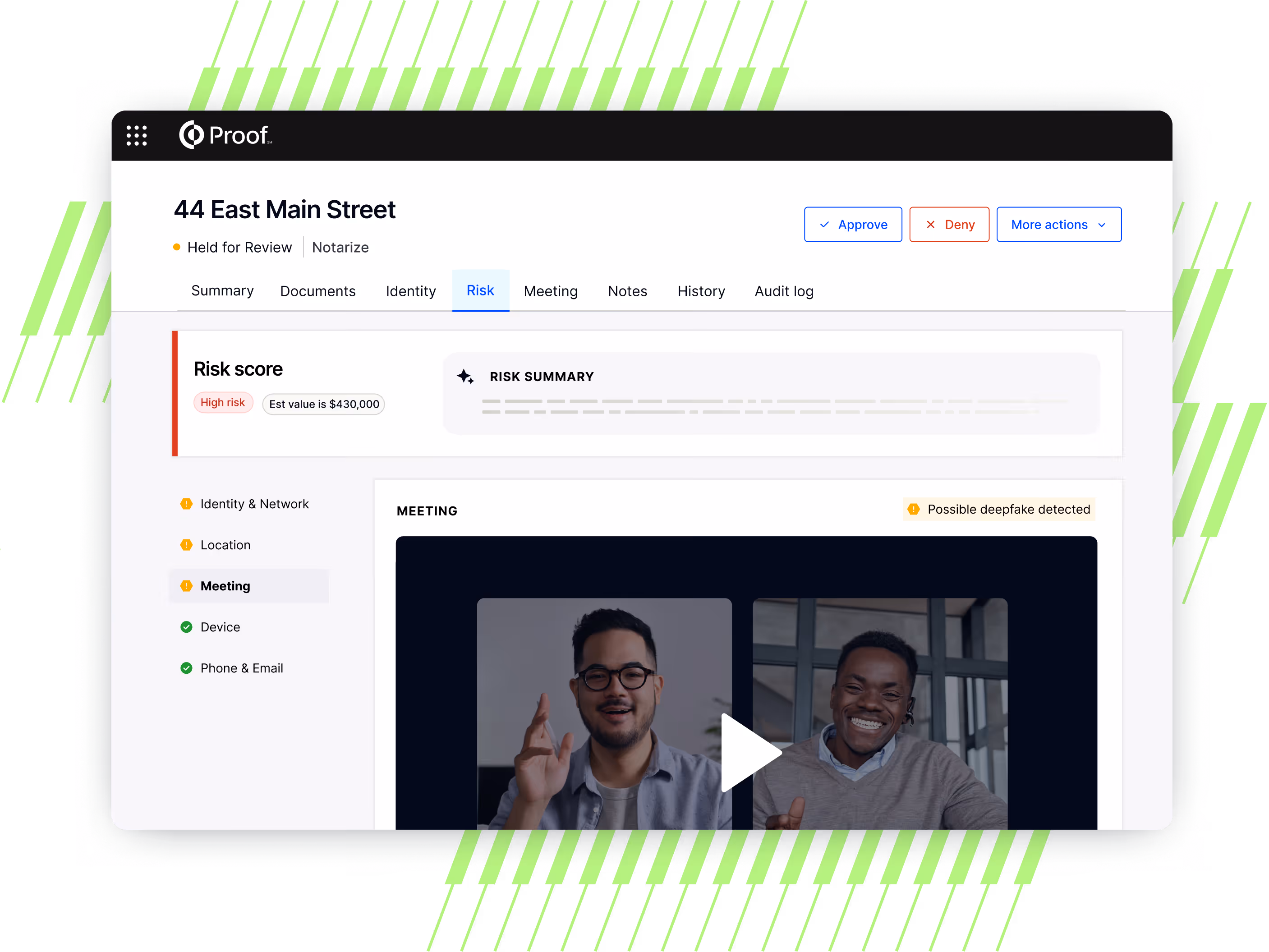 Deed fraud and seller impersonation have always been a risk. Now fraudsters are using AI to fake identities on live video calls. Defend is the only closing platform that detects deepfakes during an online notary meeting — plus flags risk signals across every transaction automatically.